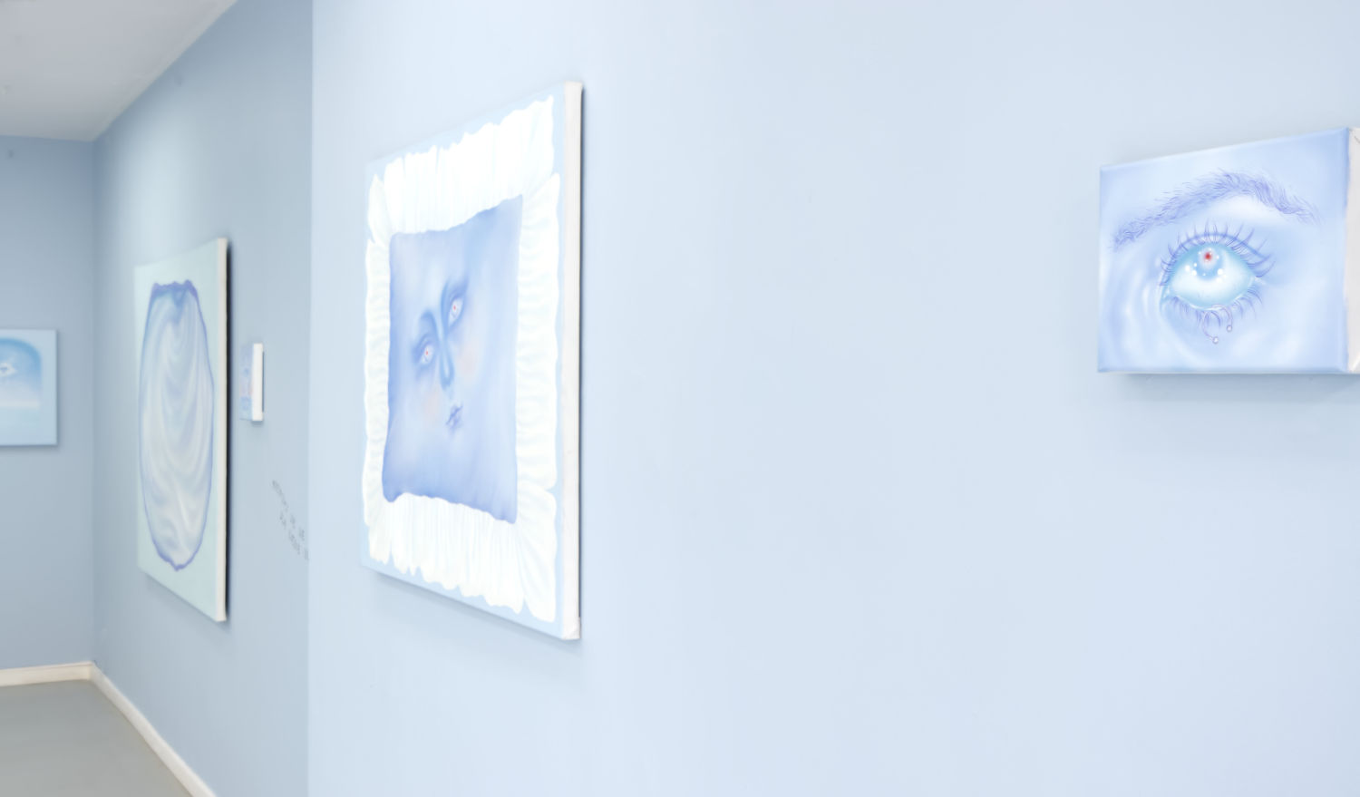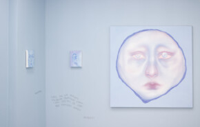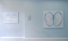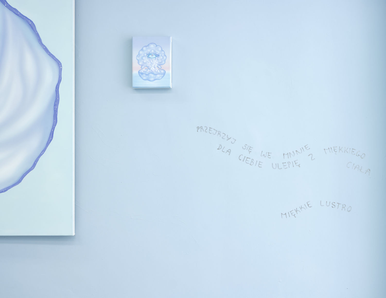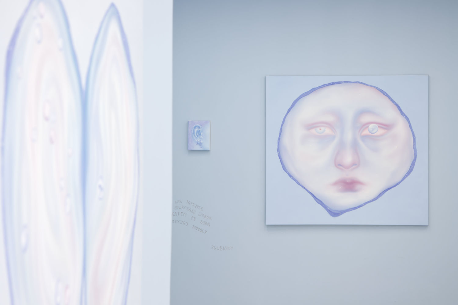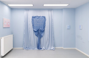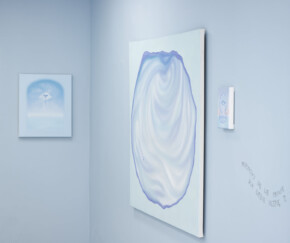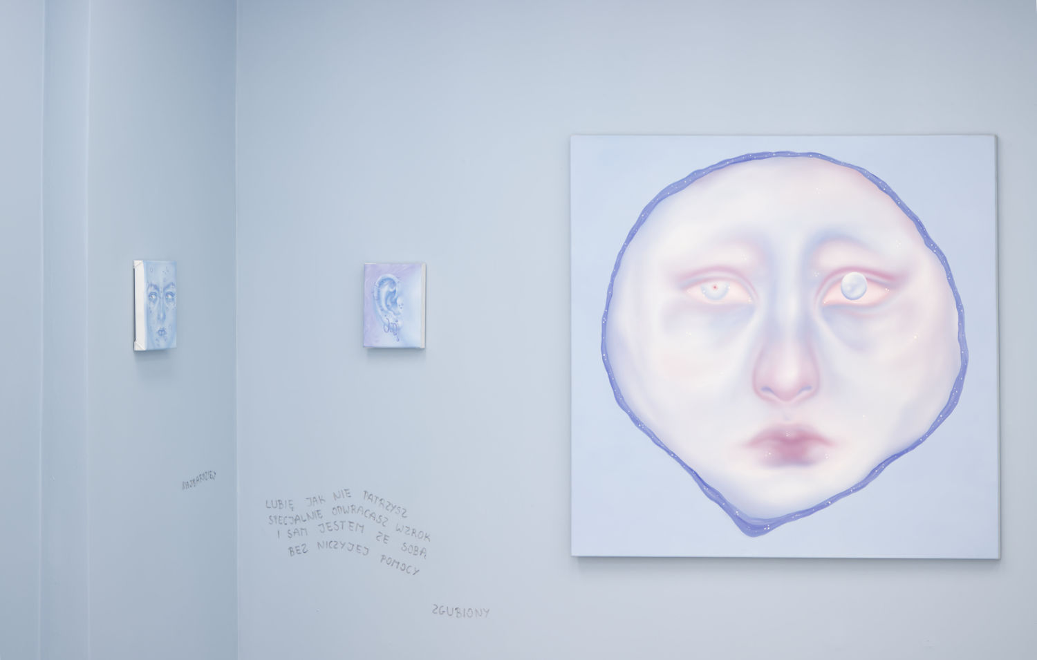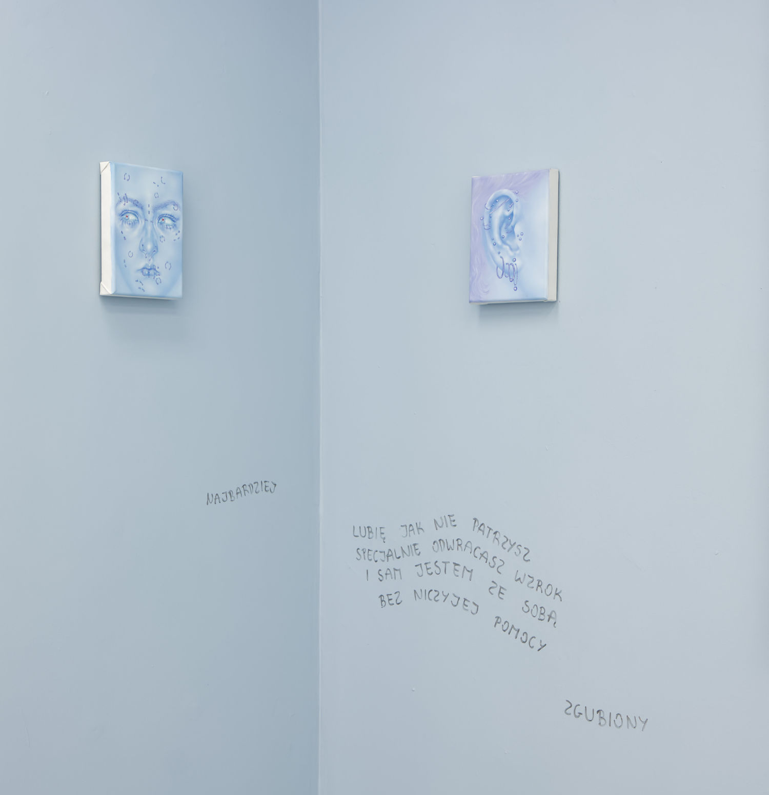Blue becomes the dominant element of the exhibition – present both in the paintings and in the space itself. It envelops, calms and slows down. Blue has a regulating function – it symbolises safety, calmness and an attempt to tame difficult emotions. At the same time, it serves as a backdrop for stories about fragility and the need for closeness. In his latest works, blue is accompanied by light pink – subtle, illuminating, present like a small gesture of tenderness towards oneself and others, attempting to fill what is often lacking in relationships.