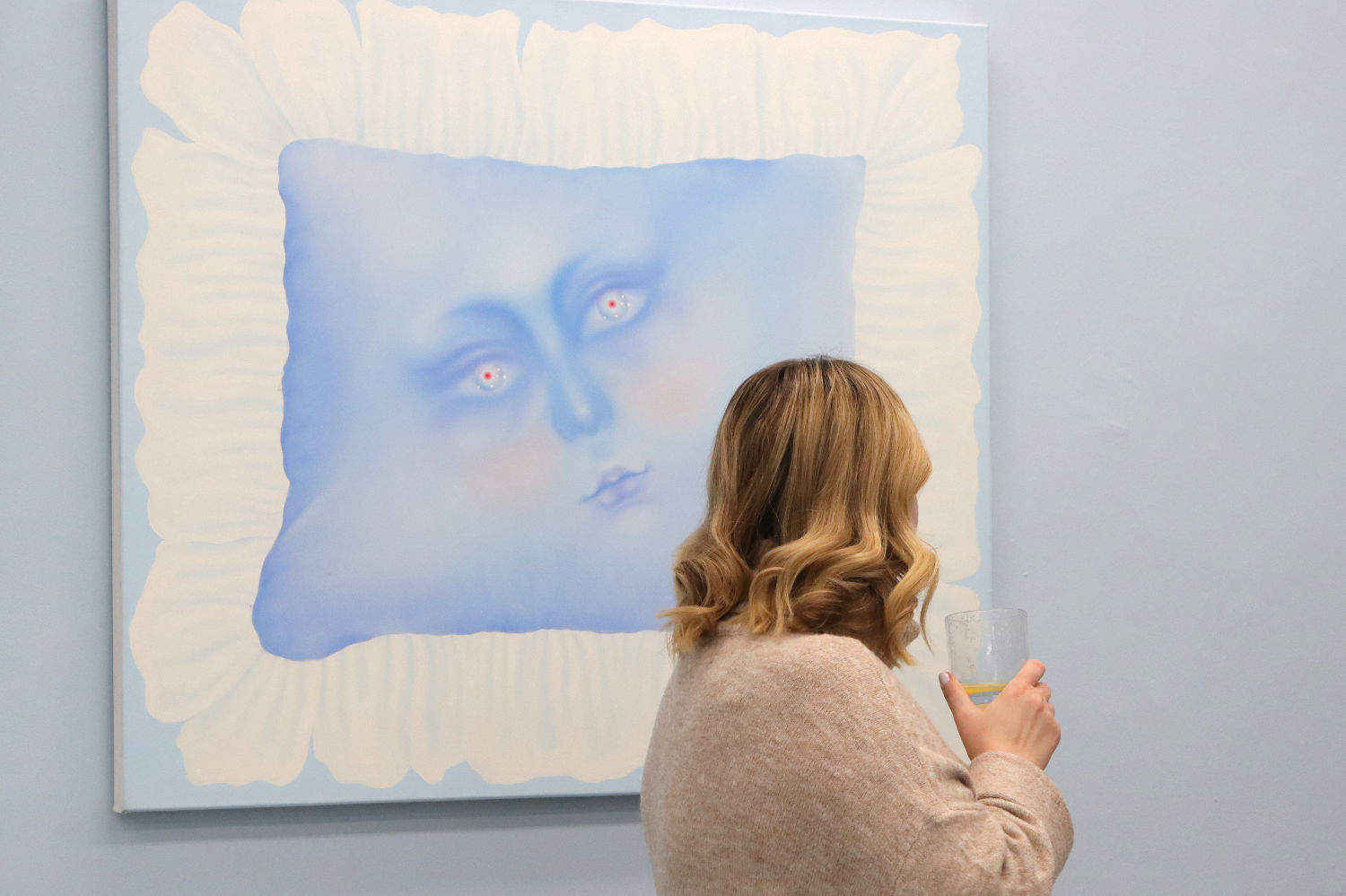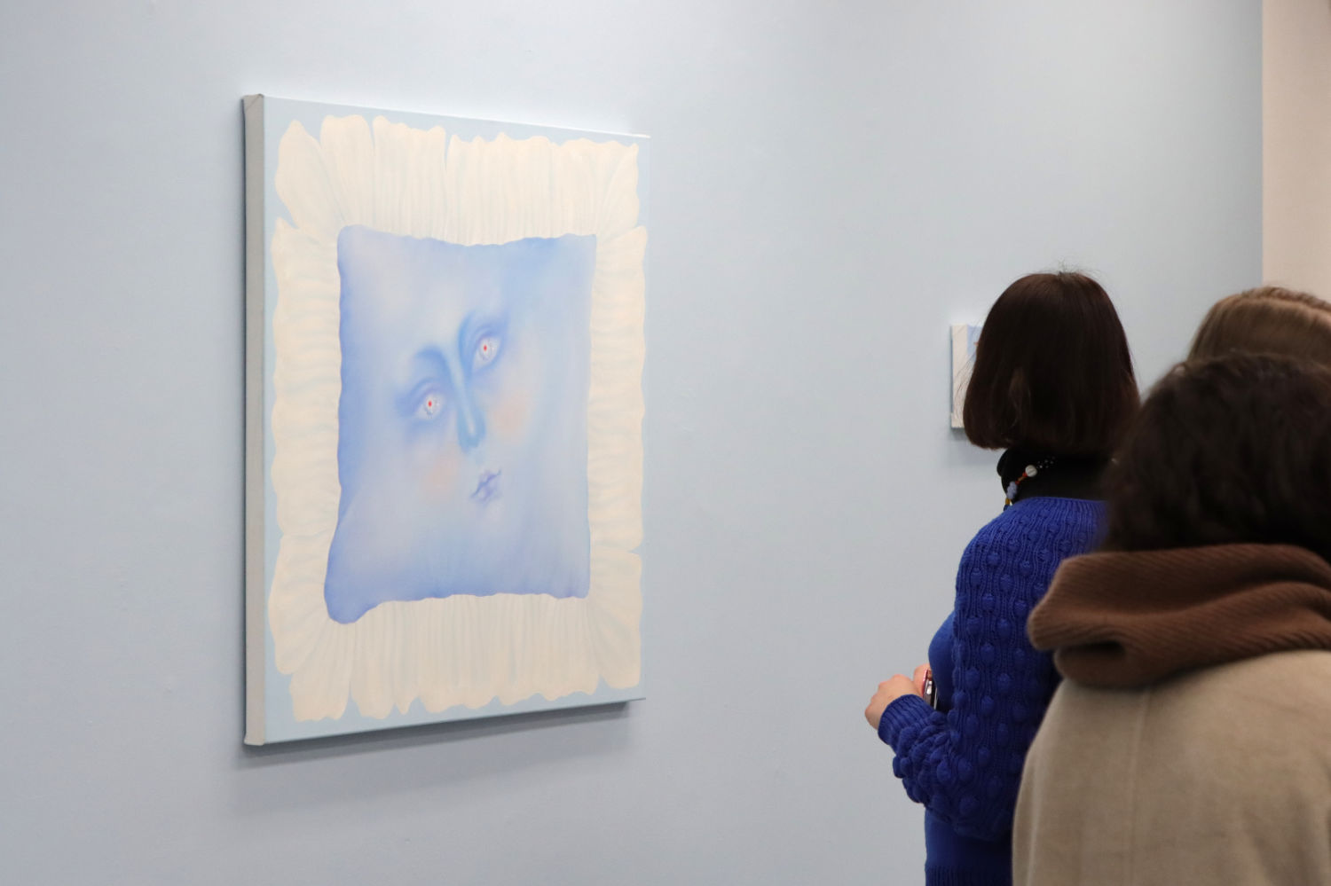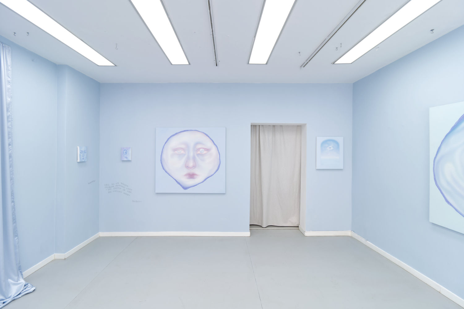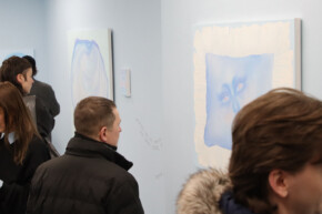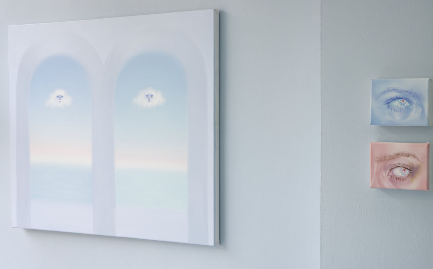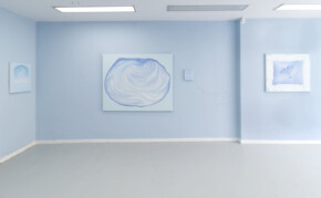 Blue becomes the dominant element of the exhibition – present both in the paintings and in the space itself. It envelops, calms and slows down. Blue has a regulating function – it symbolises safety, calmness and an attempt to tame difficult emotions. At the same time, it serves as a backdrop for stories about fragility and the need for closeness. In his latest works, blue is accompanied by light pink – subtle, illuminating, present like a small gesture of tenderness towards oneself and others, attempting to fill what is often lacking in relationships.