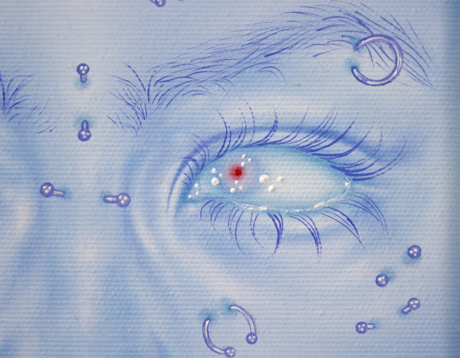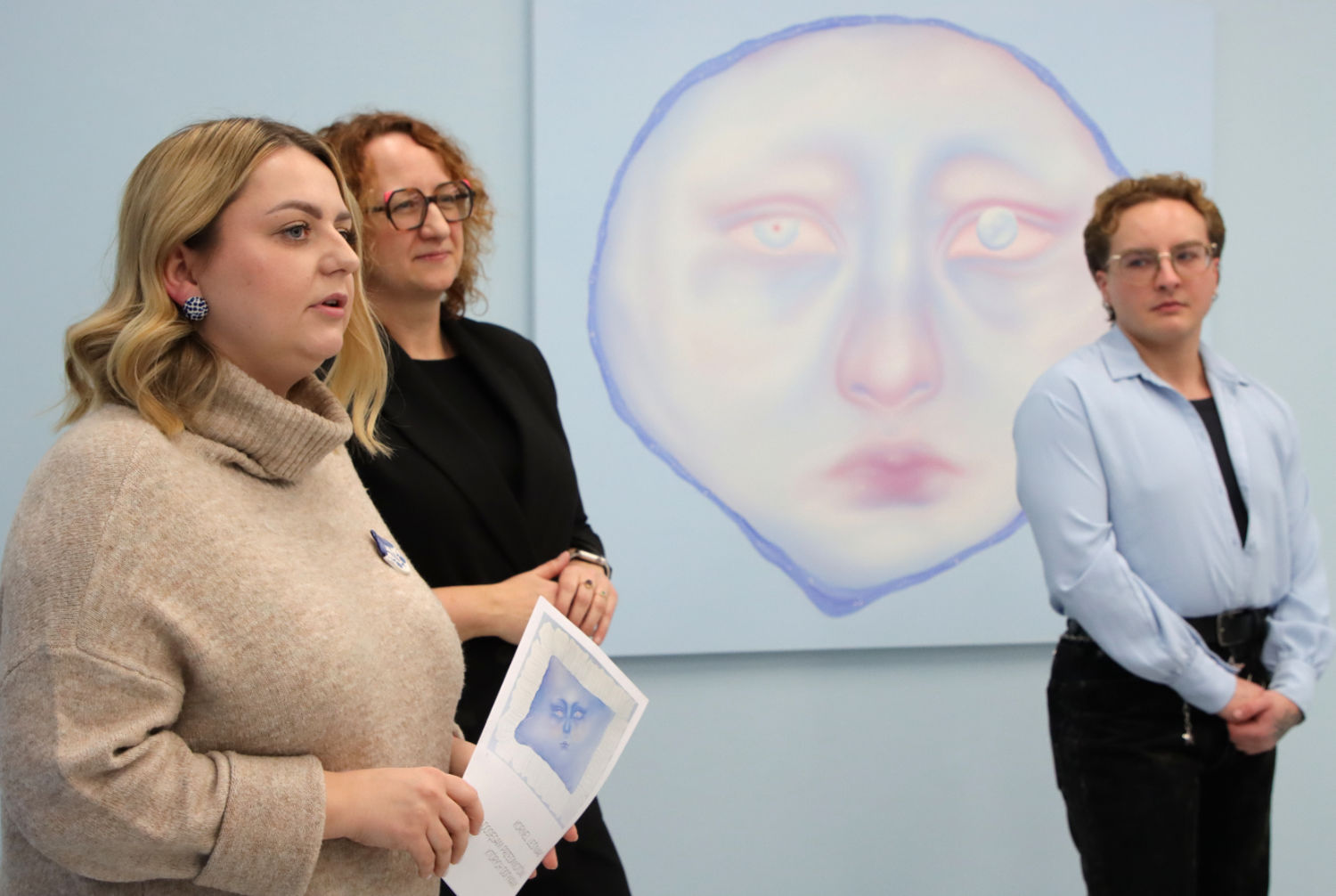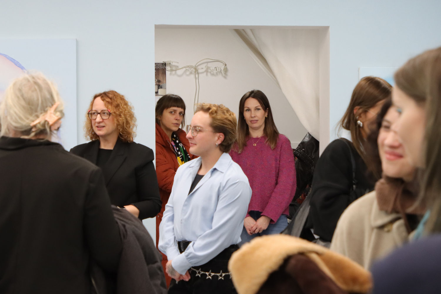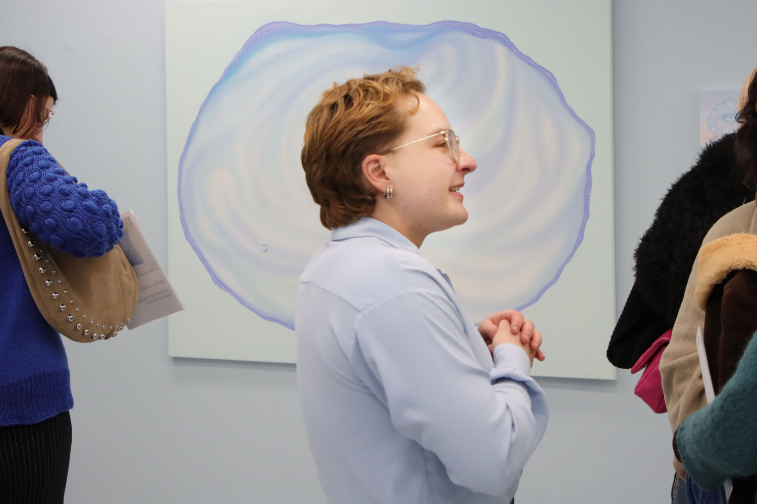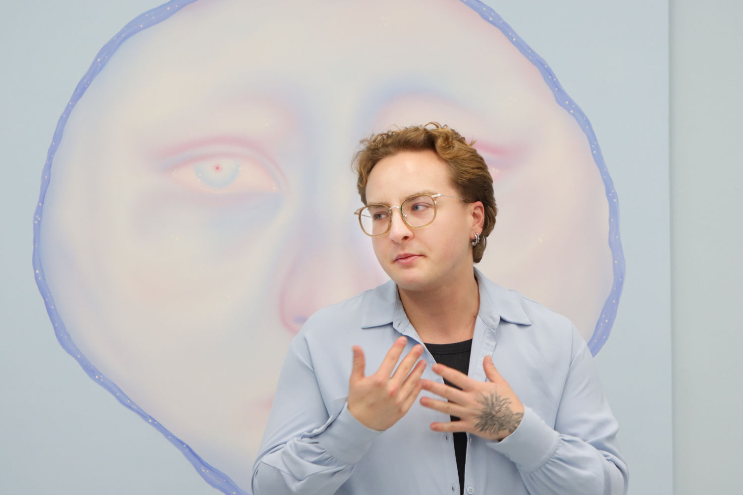 Blue becomes the dominant element of the exhibition – present both in the paintings and in the space itself. It envelops, calms and slows down. Blue has a regulating function – it symbolises safety, calmness and an attempt to tame difficult emotions. At the same time, it serves as a backdrop for stories about fragility and the need for closeness. In his latest works, blue is accompanied by light pink – subtle, illuminating, present like a small gesture of tenderness towards oneself and others, attempting to fill what is often lacking in relationships.