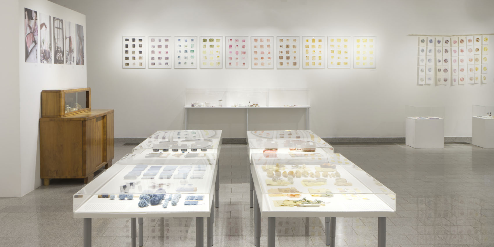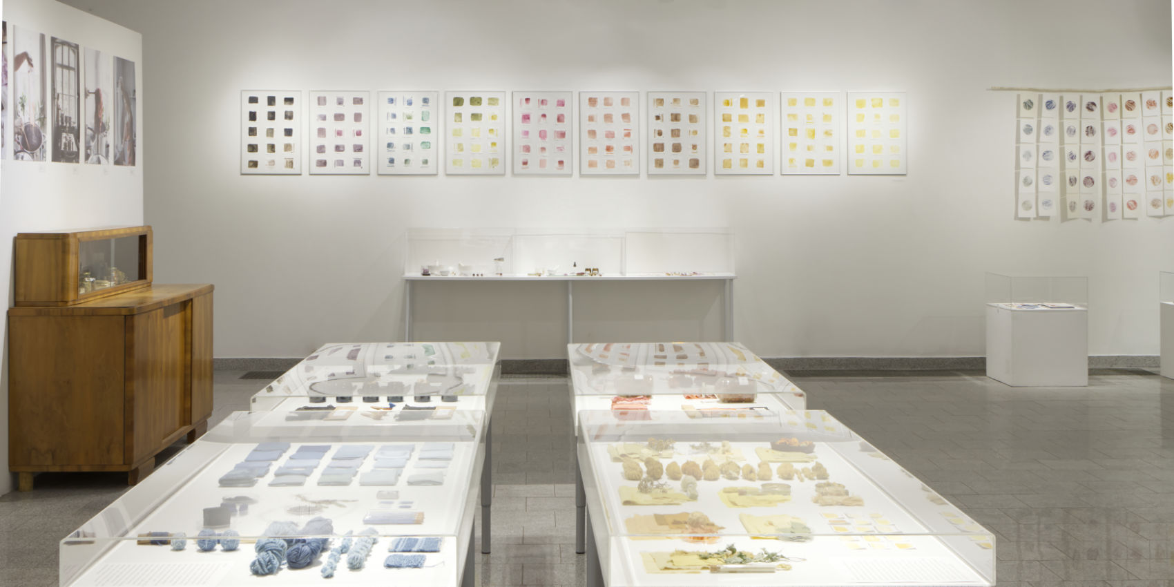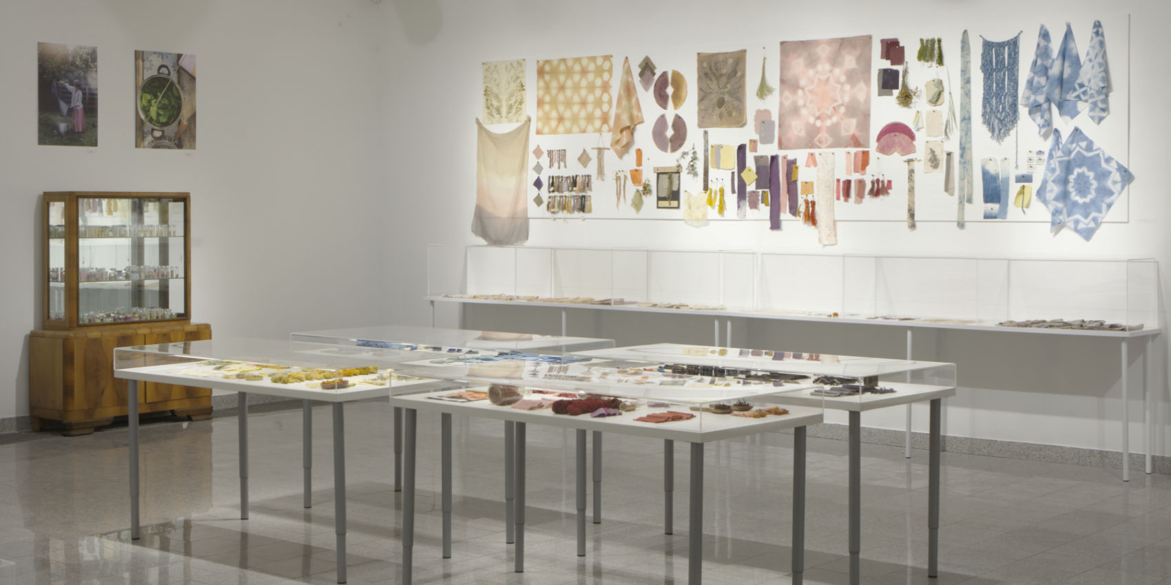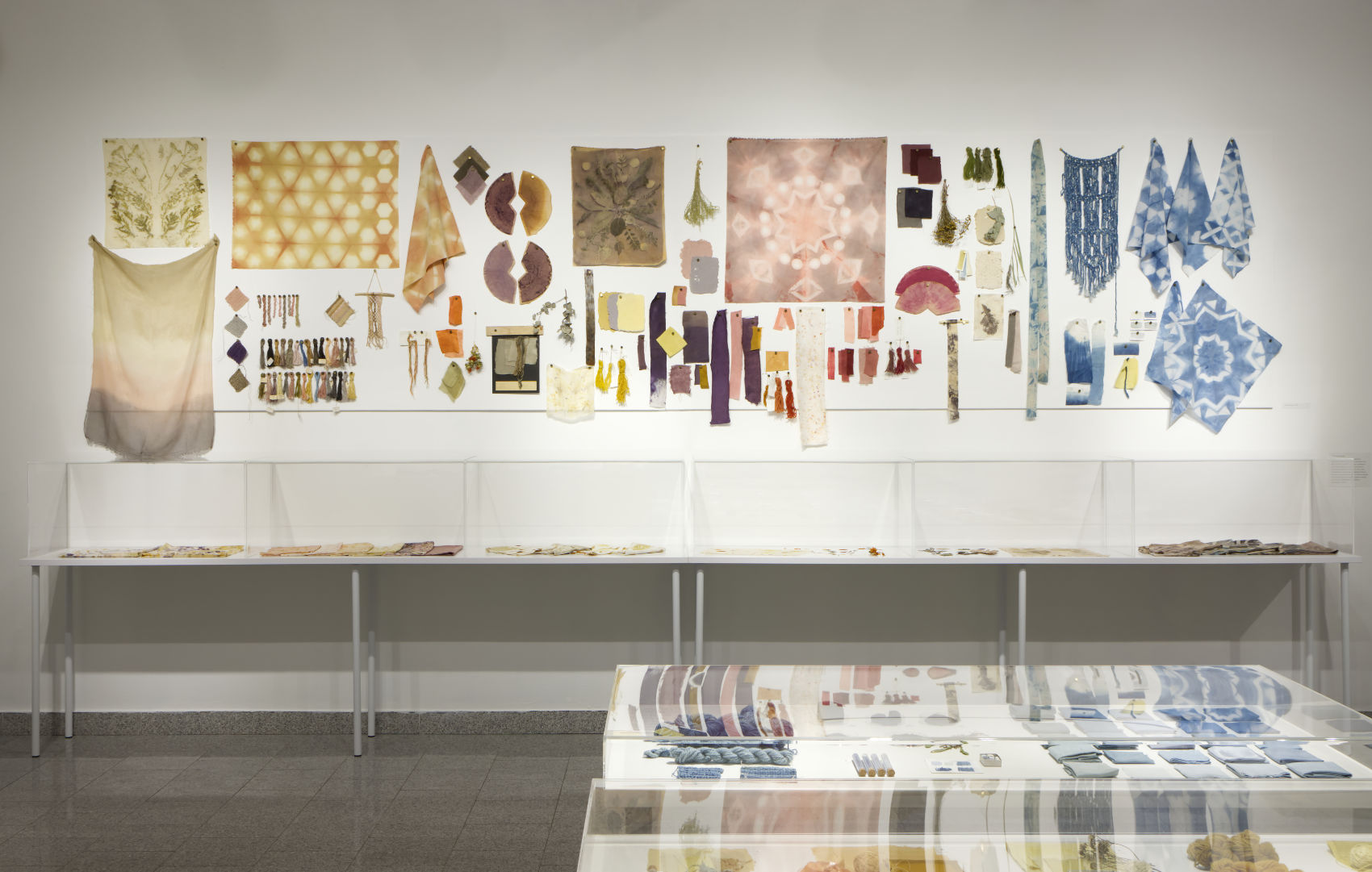 At the exhibition, we explain how you can discover and create colour yourself. It is a slow process by nature, requiring great concentration, and rich in sensory experiences. It begins with a trip to the meadow, the forest, and the gathering of plants. The next stage involves craftsmanship – tending to cauldrons filled with fragrant dye extracts, dyeing fibres in baths, or obtaining essential pigments and producing paints. Finally, the colours created are used in the further creation of works and compositions.