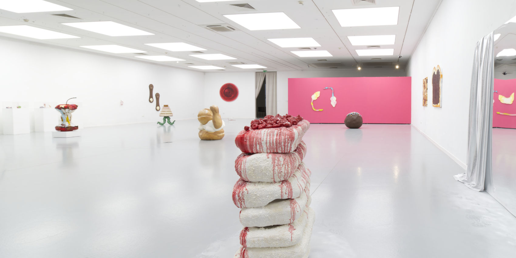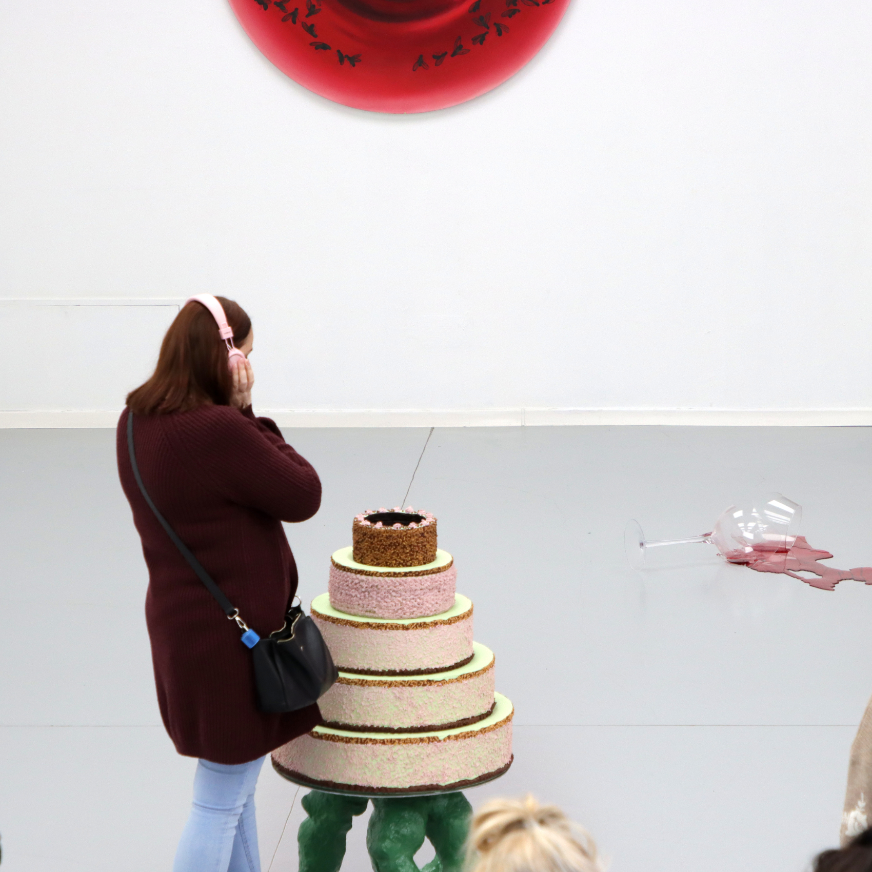 Karolina Konopka tworzy słodko-gorzki świat, balansujący na granicy przyjemności i niepokoju, ujawniając ukryte społeczne mechanizmy, które kształtują nasze podejście do ciała, jedzenia i konsumpcji. Jej prace nie tylko cieszą oczy, ale także skłaniają do refleksji nad tym, jak rytuały związane z jedzeniem, obfitością i celebracją wpływają na naszą psychikę. Chociaż na pierwszy rzut oka jej twórczość – obejmująca malarstwo, rzeźbę, wideo i tekst – jest pełna kolorów, błyszcząca i apetyczna, to pod cukrową powierzchnią kryje się krytyka współczesnych rytuałów społecznych, takich jak świętowanie czy wspólne i samotne posiłki. Torty, które stają się centralnym punktem jej dzieł, nie są tylko estetycznymi obiektami, lecz symbolizują obfitość, rytuał, przymus i społeczne oczekiwania. Cukiernicze giganty, które tworzy, są połączeniem refleksji nad kulturą masową, tradycjami i współczesnymi oczekiwaniami, które towarzyszą nam przez całe życie. Konopka bada, jak codzienne akty jedzenia, choć pozornie banalne, pełne są ukrytych znaczeń i emocji.