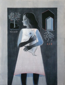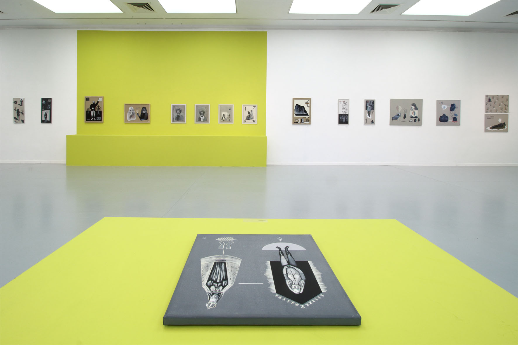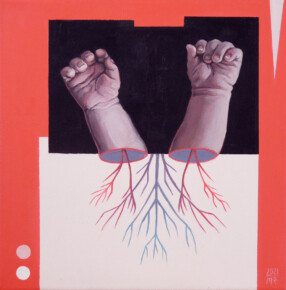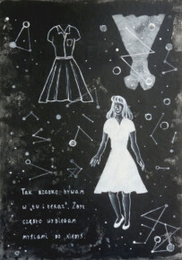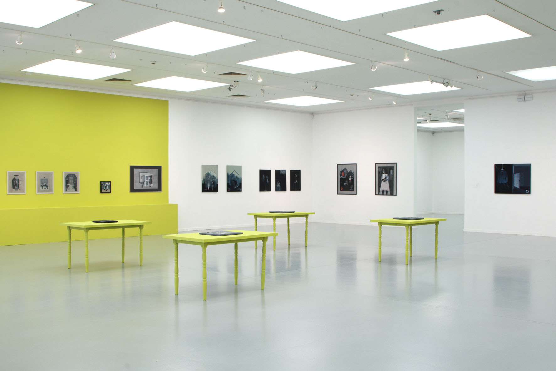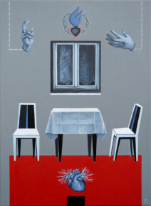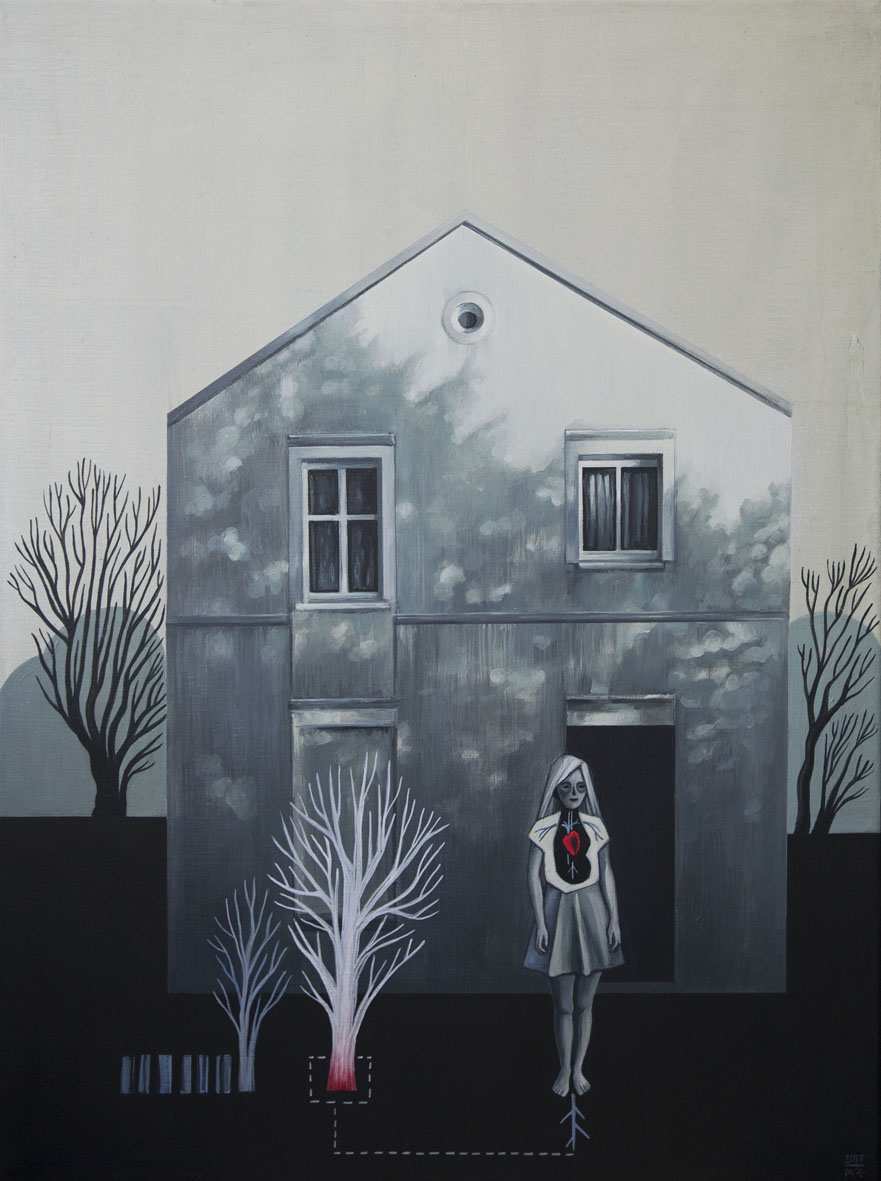 Oto dom. Oto człowiek. Oto dłoń. Prosty obraz. Figura i tło. Oczywistość. W przekładzie werbalnym obraz ten jest orzekający i zwięzły niczym zdanie w starym elementarzu. Jednak w tym miejscu na myśl niemal automatycznie przychodzi skojarzenie ze Zdradliwością obrazów Magritte’a. I wszystko zaczyna się komplikować. Malarstwo nie rządzi się bowiem zasadami podobnymi językowi. To nie zbiór znaków ani wokabularz. Jeśli odrzucić perspektywę, nie ma w nim linearnej sekwencyjności, określonych zasad następstwa. Figurę i tło łączy nieustanna relacja inwersji. Istotą obrazu jest międzyprzestrzeń – milczące, semantycznie puste pole. Nieoczywistość. Miejsce, któremu ciężko przypisać jednoznaczny sens językowy, a które jest niezbędne dla artykulacji sensu wizualnego. Ten bowiem – jak twierdzi – Gottfried Boehm – „ […] artykułuje się na tle tego, co niepowiedziane”. Ta milcząca, pusta przestrzeń jest zatem, wbrew pozorom, gęsta – pełna korelacji, kontrastów, przejść. To pustka, która nie jest niczym. A ponieważ w moich obrazach dominuje oszczędność – amor vacui, takie pozytywne spojrzenie na niezapełnione/niedookreślone obszary płótna jest mi niezmiernie bliskie. Mimo dążeń do quasi narracyjności – wykorzystywania elementów „czytelnych”, symbolicznych, graficznych, jestem daleka od tworzenia rebusów o apriorycznych rozwiązaniach czy też historii rozwijających się w kierunku horyzontalnym. A wizualna międzyprzestrzeń umożliwia właśnie ruch w różne strony. Imersję, której celem nie jest ani horyzont ani abstrakcyjny punkt zbiegu. Międzyprzestrzeń sprawia, że malarskie kompozycje nie są frontalne, fasadowe, zamknięte. Może ona także stanowić o relacjach pomiędzy różnymi obrazami. Sprawiać, że łączą je wątki nie tylko semantyczne. A skoro już o semantyce mowa, to w tytułowej przestrzeni pomiędzy, chciałabym też dostrzec odzwierciedlenie swoich poszukiwań związanych z tożsamością, pamięcią i narracją. Z szeroko rozumianymi przestrzenią i czasem. Z domem. Dlatego na wystawie pojawią się prace związane z tą tematyką, między innymi te pochodzące z doktorskiego cyklu Wyniesione z domu („Części pierwsze”, „Wywnętrzanie”, „Nie-miejsca”) oraz nowe obrazy z cyklu „Czułe miejsca”. Obrazy lapidarne w formie. Oszczędne w kolorze. Kameralne, powściągliwe, milczące.